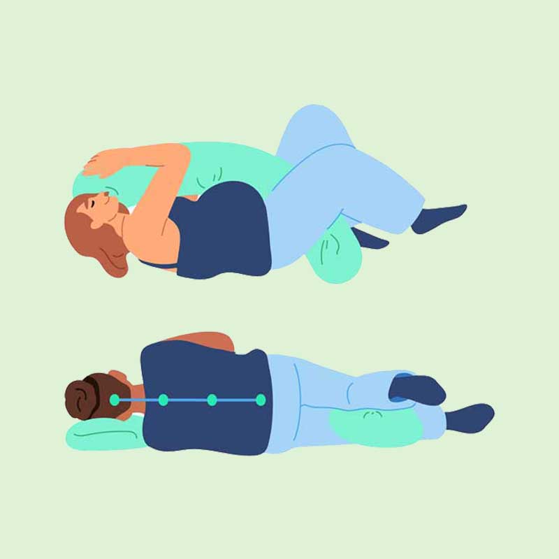 Spavanje na boku: Spavanje na levoj strani sa savijenim kolenima poboljšava protok krvi i smanjuje rizik od oticanja u zglobovima i nogama. Upotreba trudničkog jastuka ispod stomaka ili između kolena može pomoći u poravnavanju kičme i dodatnoj udobnosti.